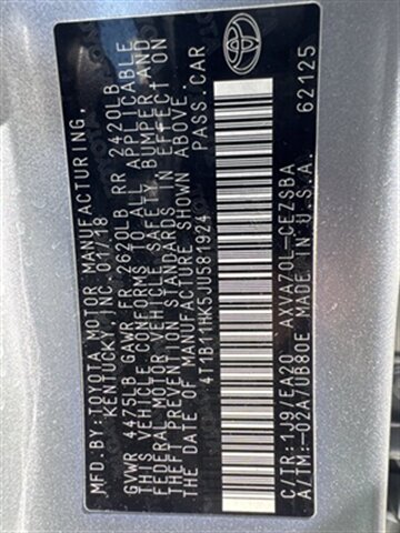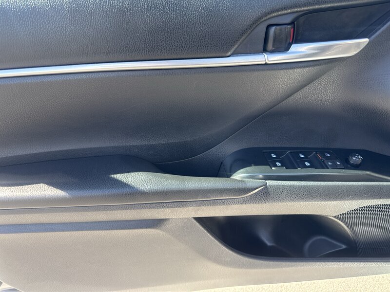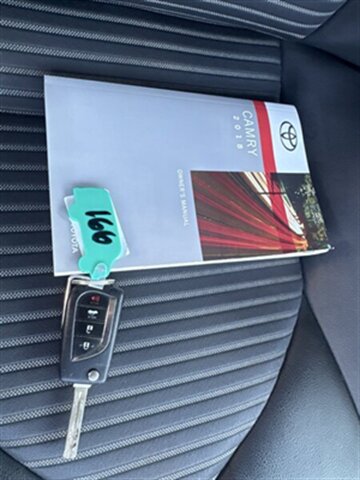2018 Toyota Camry SE in Celestial Silver Metallic with a Black interior, powered by a 2.5L I4 engine producing 203 hp and 184 ft-lbs of torque. Factory equipment includes the SE sport package with a sport-tuned suspension, alloy wheels, rear lip spoiler and dual exhaust tips; projector headlights with LED daytime running lights and fog lamps; leather-wrapped steering wheel and shift knob with sport cloth seats; power-adjustable driver’s seat and 60/40 split-folding rear seat; keyless entry with push-button start; Entune infotainment with touchscreen, Bluetooth, USB inputs and a multi-speaker audio system; a rearview camera; and Toyota Safety Sense-P advanced safety suite (pre-collision with pedestrian detection, lane departure alert with steering assist, adaptive cruise control and automatic high beams).